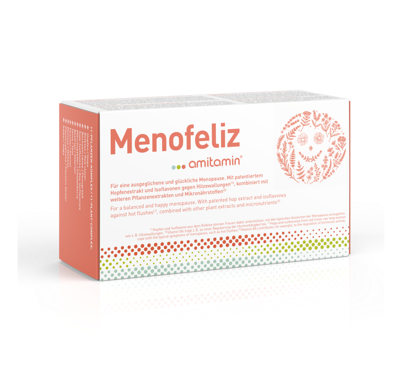 | Ingredients (TXT) | Zutaten: Calciumcarbonat, Überzugsmittel: Hydroxypropylmethylcellulose, Rotklee-Extrakt, Magnesiumoxid, Baldrianwurzel-Extrakt, D-alpha-Tocopherylacetat, Hopfen-Extrakt, Melissenblatt-Extrakt, Bockshornklee-Samenpulver, Yamswurzel-Extrakt, Fenchel-Extrakt, Salbei-Extrakt, Sojabohnen-Extrakt, Riboflavin, Thiamin Hydrochlorid, Passionsblumen-Extrakt, Nicotinamid, Methylcobalamin auf Maltodextrin, Pyridoxin Hydrochlorid, Calciumpantothenat, Mönchspfeffer-Extrakt, Vitamin D3, Zinkbiglycinat, Natriumselenit auf Calciumcarbonat, Folsäure, Kaliumjodid |