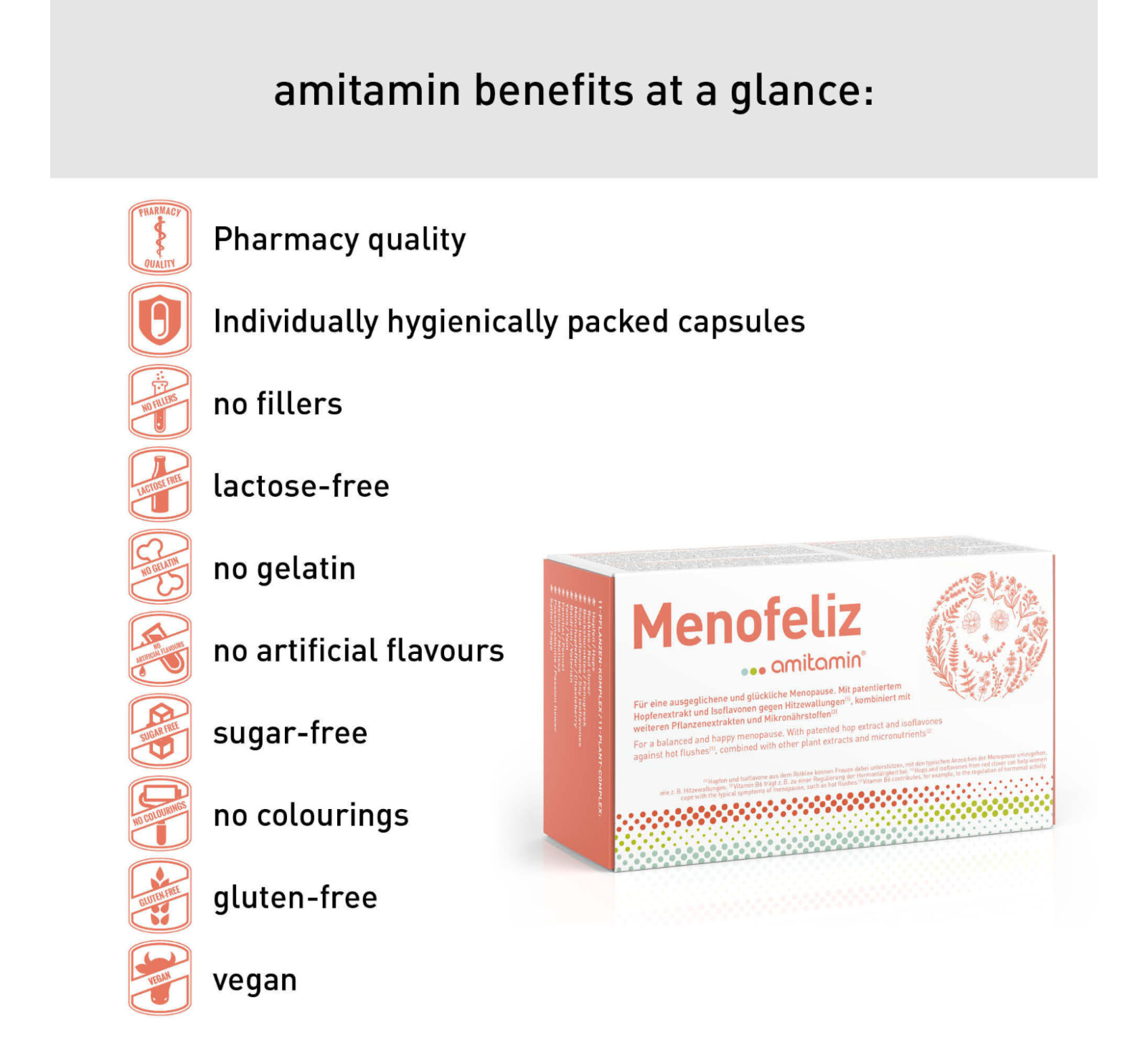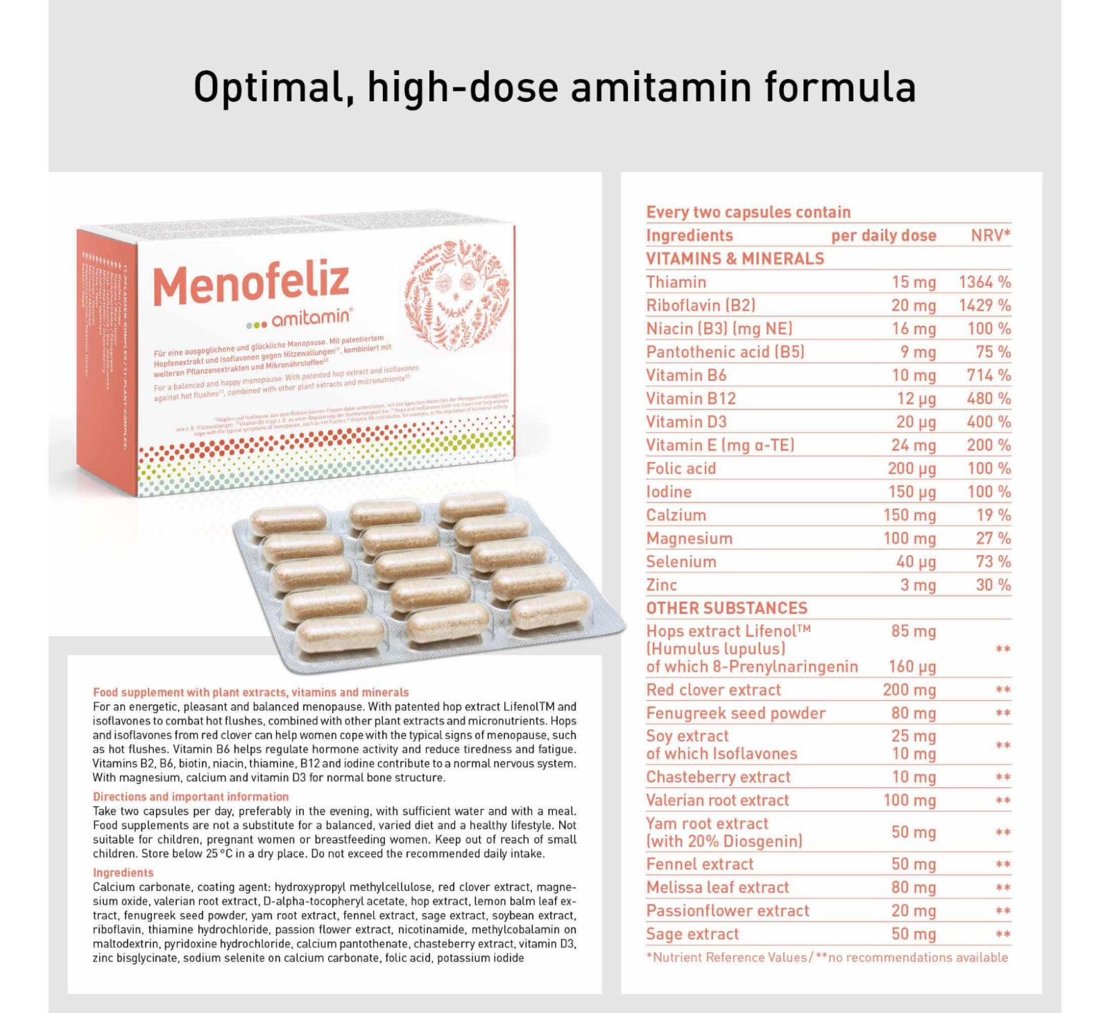 | Ingredients | Calcium carbonate, coating agent: hydroxypropyl methylcellulose, red clover extract, magnesium oxide, valerian root extract, D-alpha-tocopheryl acetate, hop extract, lemon balm leaf extract, fenugreek seed powder, yam root extract, fennel extract, sage extract, soybean extract, riboflavin, thiamine hydrochloride, passion flower extract, nicotinamide, methylcobalamin on maltodextrin, pyridoxine hydrochloride, calcium pantothenate, chasteberry extract, vitamin D3, zinc bisglycinate, sodium selenite on calcium carbonate, folic acid, potassium iodide |