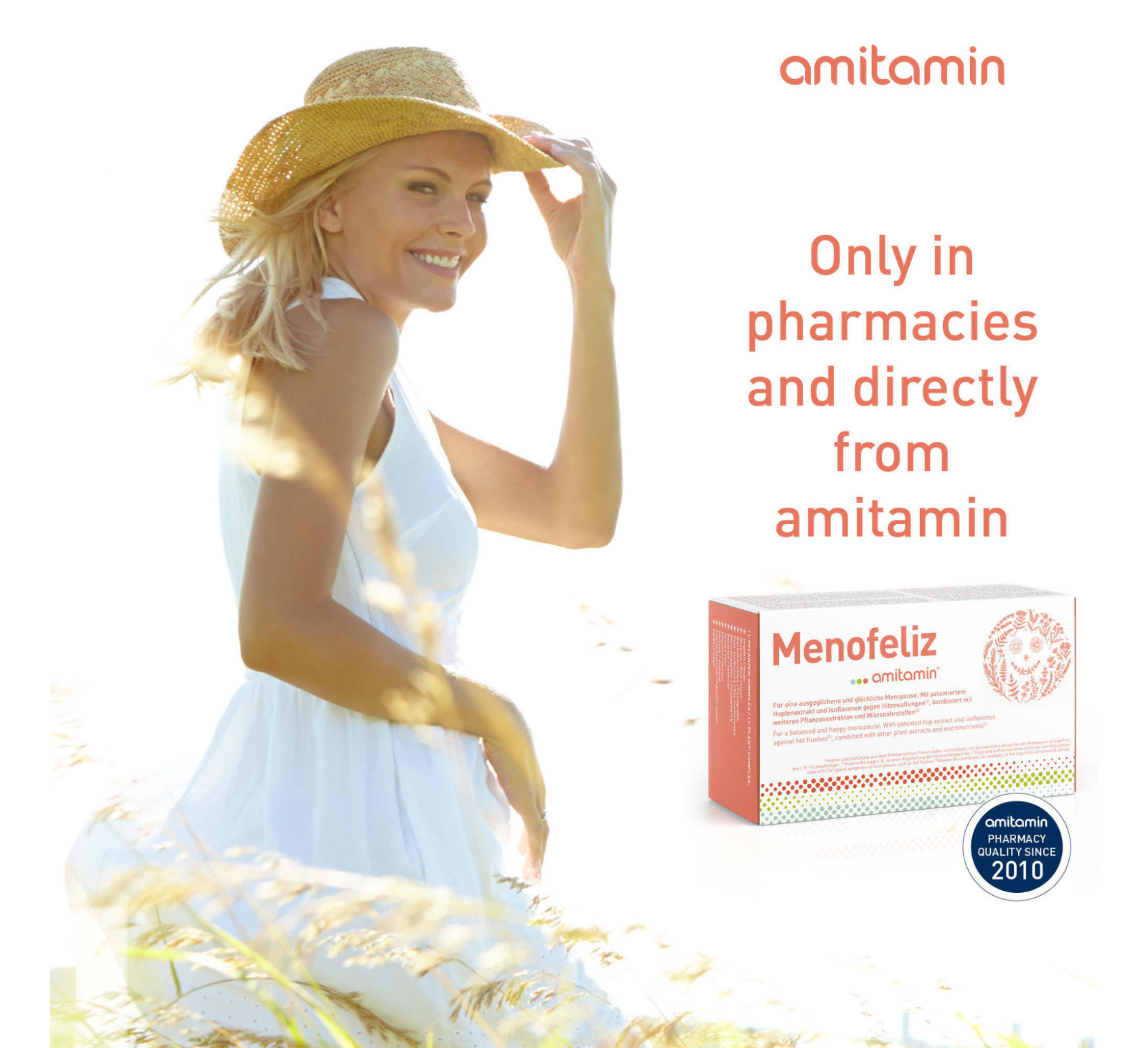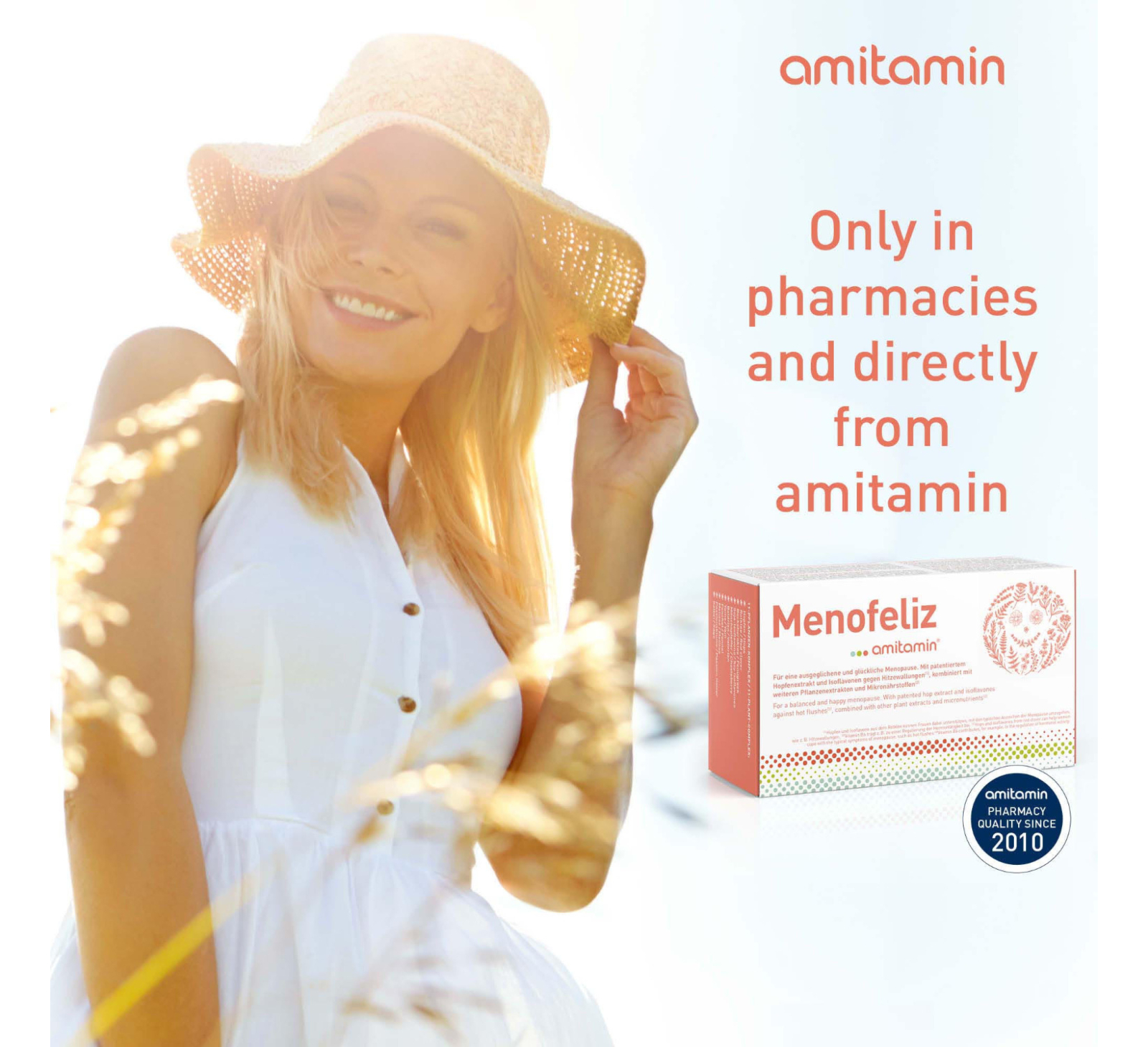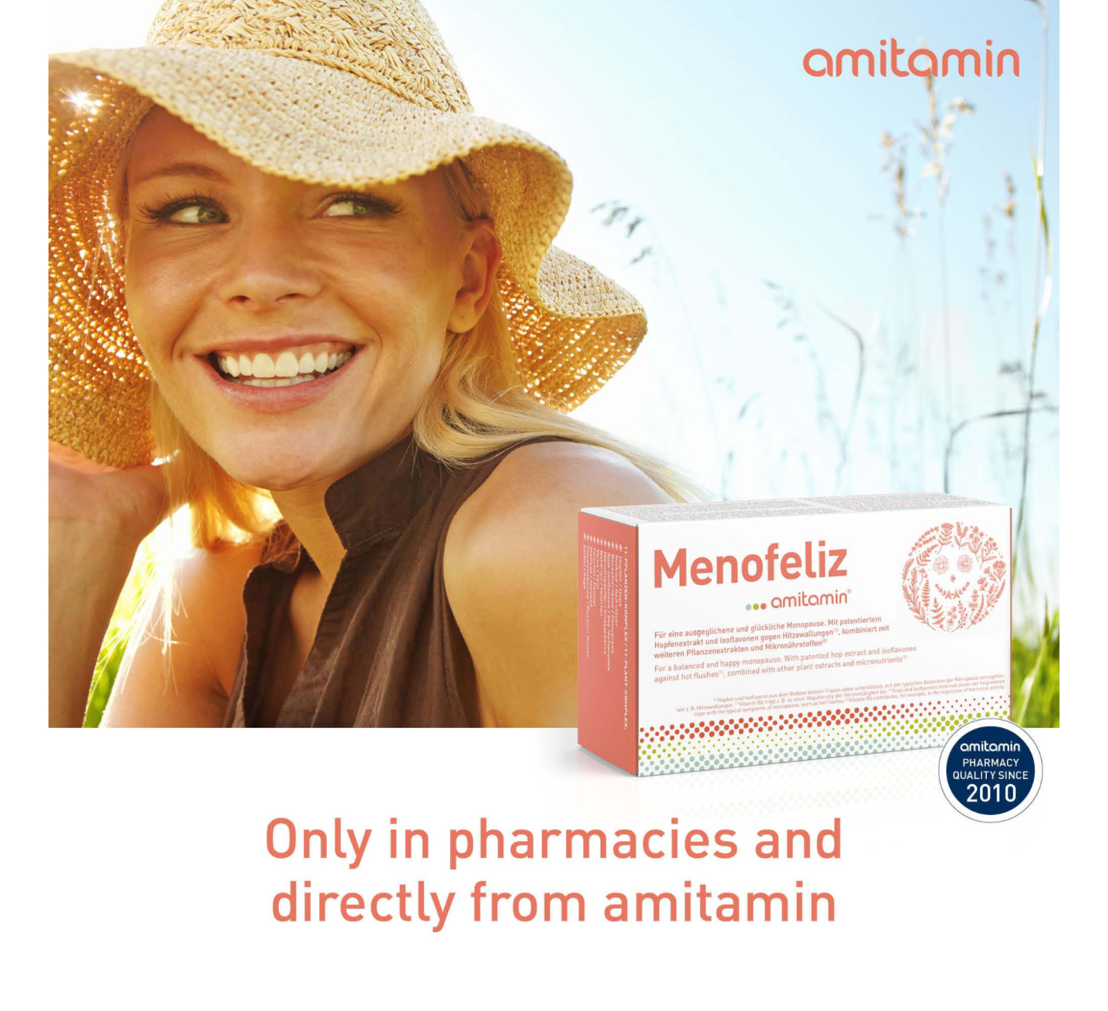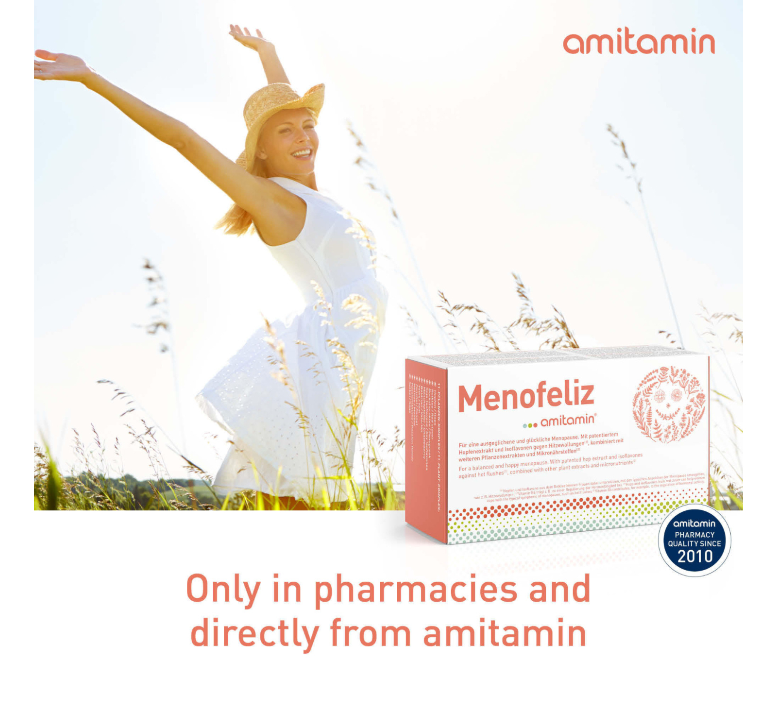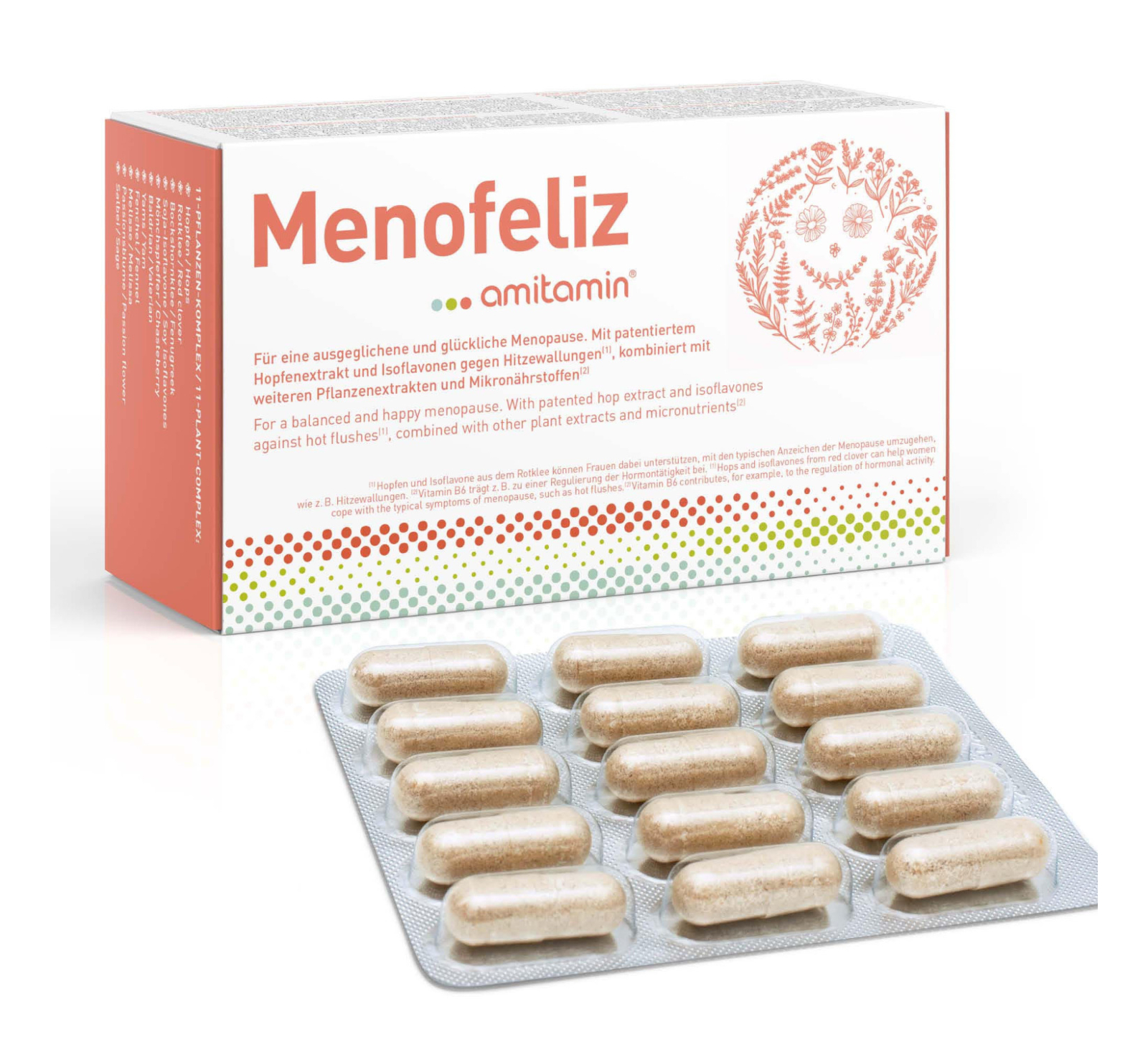 amitamin® Menofeliz is probably the most comprehensive formula for women in the menopause. 11 valuable plant extracts combined with important B vitamins and trace elements for hormone balance, nerves, energy and against fatigue. amitamin® Menofeliz also makes an important contribution to maintaining normal bones.