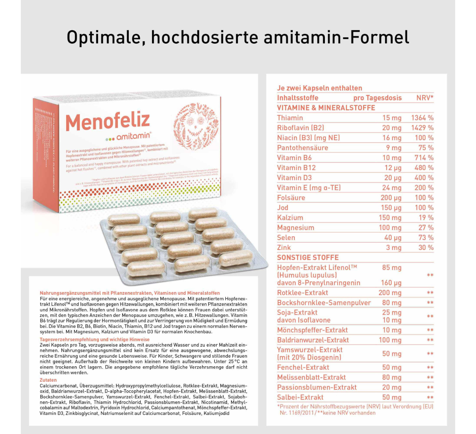 | Inhaltstoffe | Calciumcarbonat, Überzugsmittel: Hydroxypropylmethylcellulose, Rotklee-Extrakt, Magnesiumoxid, Baldrianwurzel-Extrakt, D-alpha-Tocopherylacetat, Hopfen-Extrakt, Melissenblatt-Extrakt, Bockshornklee-Samenpulver, Yamswurzel-Extrakt, Fenchel-Extrakt, Salbei-Extrakt, Sojabohnen-Extrakt, Riboflavin, Thiamin Hydrochlorid, Passionsblumen-Extrakt, Nicotinamid, Methylcobalamin auf Maltodextrin, Pyridoxin Hydrochlorid, Calciumpantothenat, Mönchspfeffer-Extrakt, Vitamin D3, Zinkbisglycinat, Natriumselenit auf Calciumcarbonat, Folsäure, Kaliumjodid |