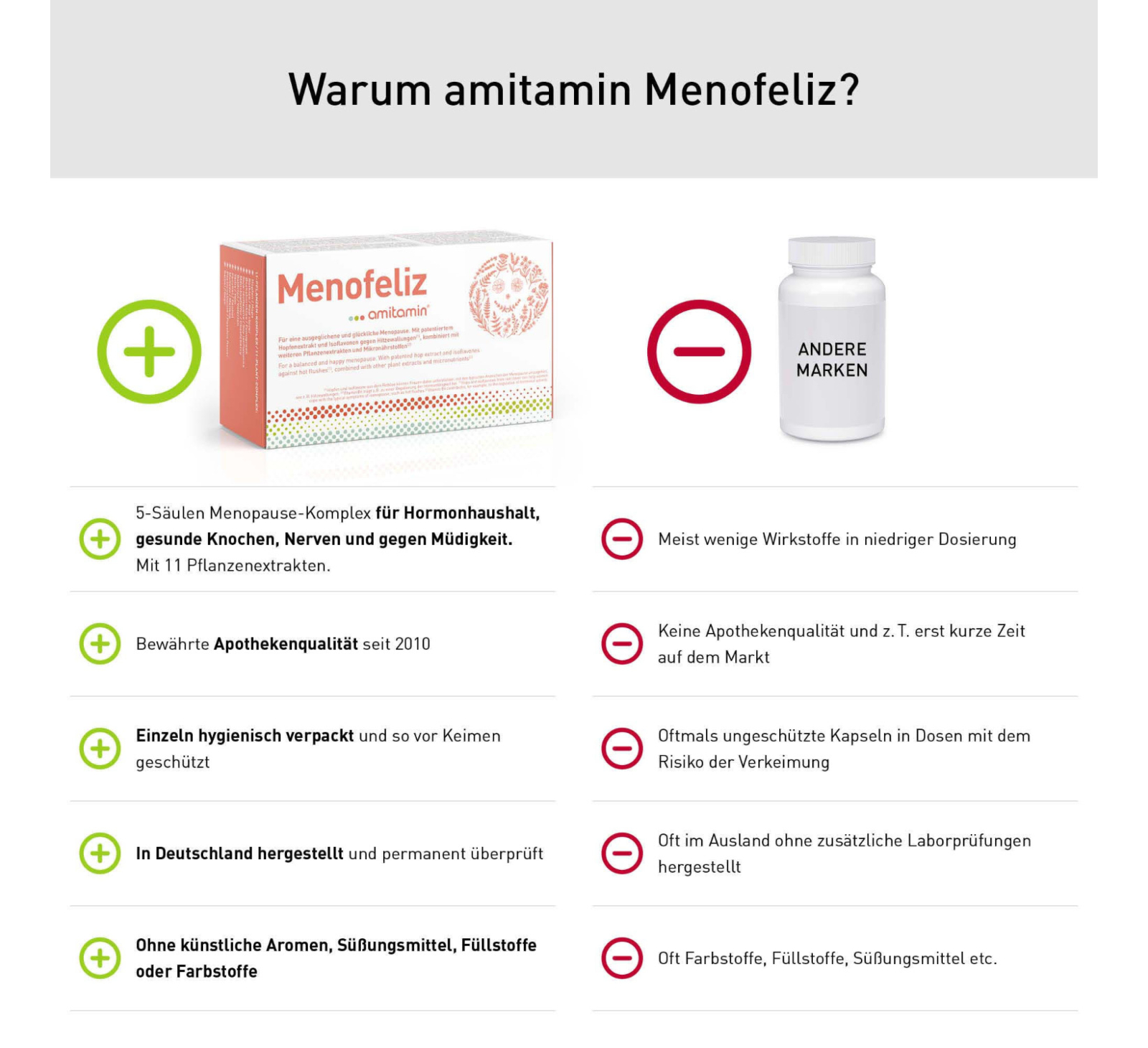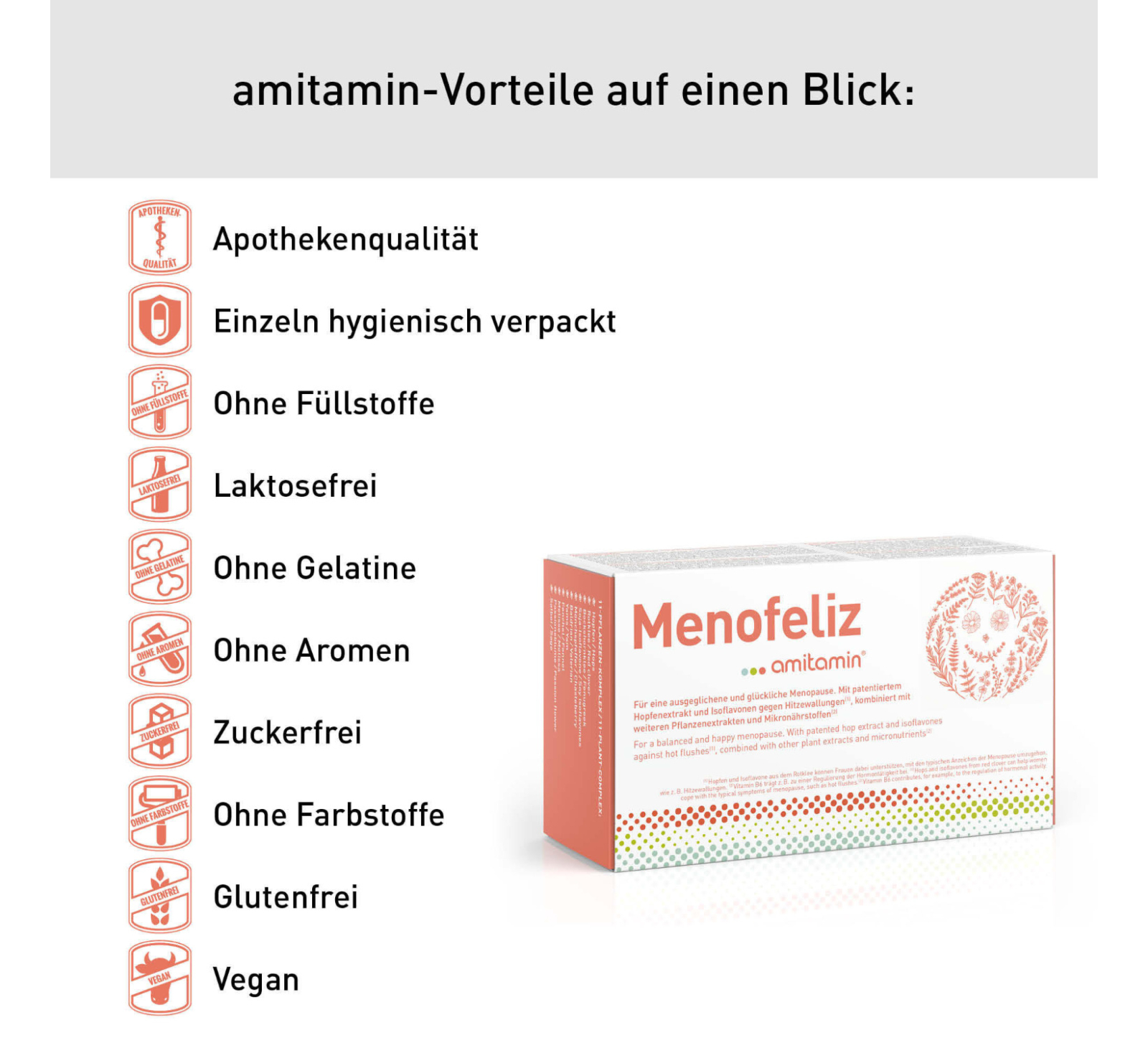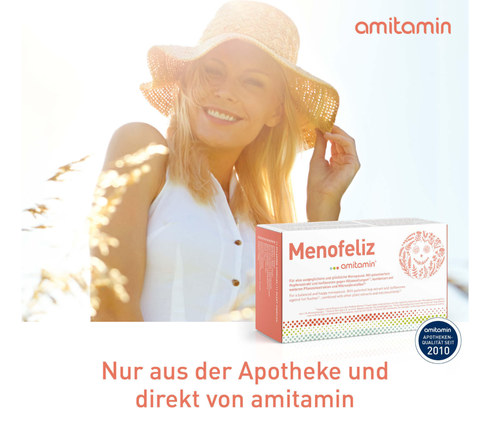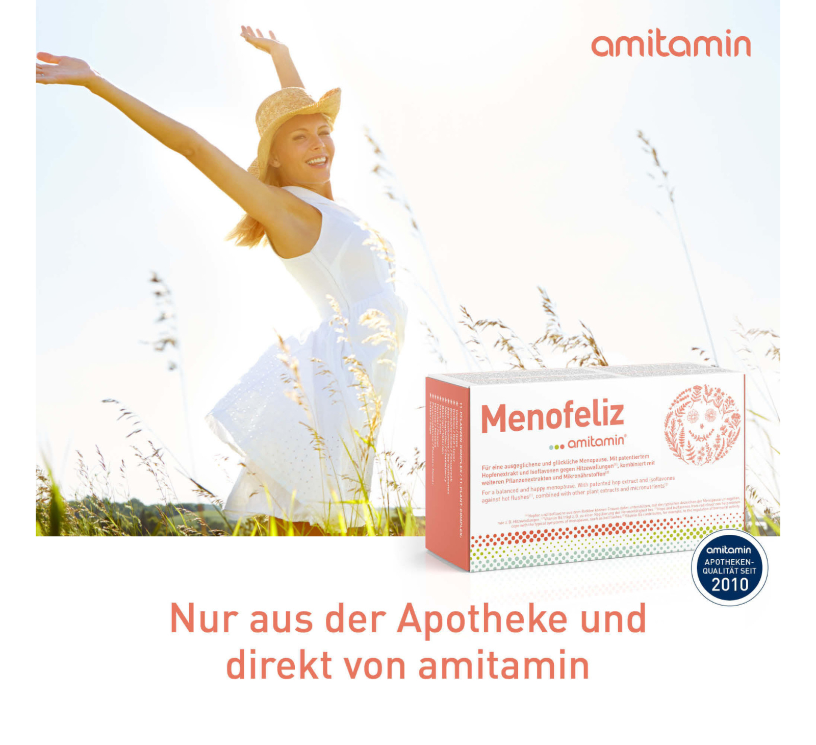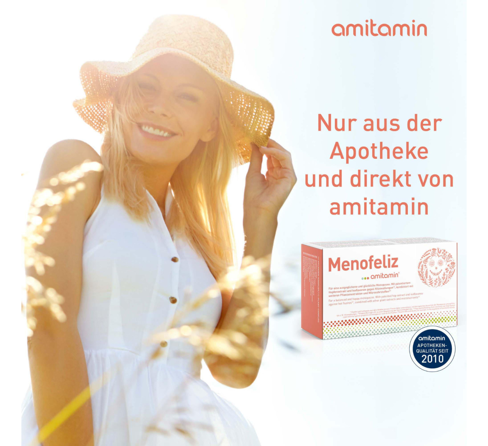 amitamin® Menofeliz ist die vermutlich beste Menopause Nahrungsergänzung auf dem Markt. Die spezielle Rezeptur basiert auf Mikronährstoffen und Pflanzenextrakten. Diese Formel mit anhand von klinischen Studien untersuchten Wirkstoffen wurde in Deutschland entwickelt und kombiniert die Erkenntnisse von 30 Jahren intensiver klinischer Forschung. Es enthält neben bewährten Pflanzenextrakten auch den patentierten Lifenol® Hopfenextrakt mit seinem besonders hohen Gehalt am natürlichen Phytoöstrogen 8-Prenylnaringenin.